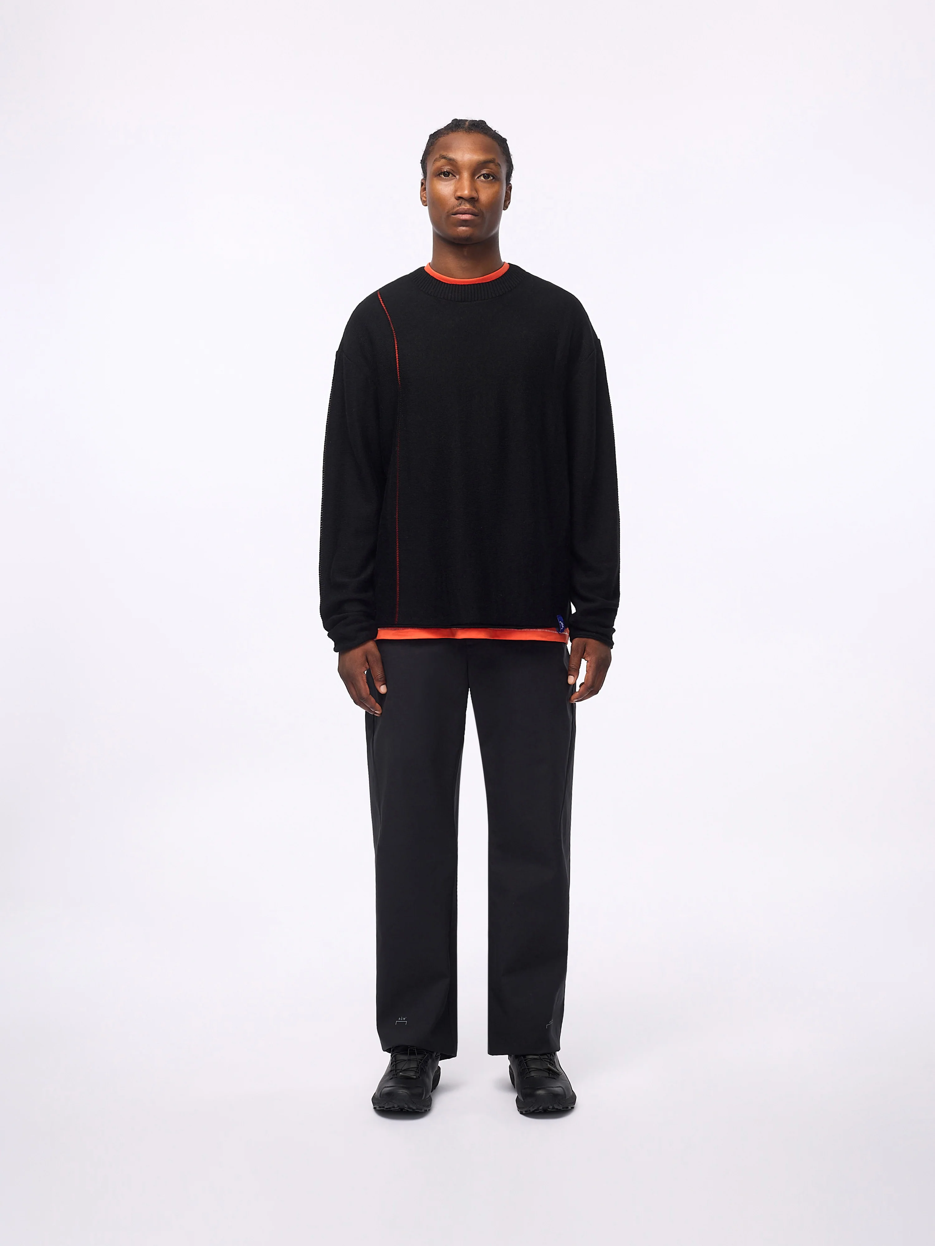 Lightweight, relaxed-fit knit jumper featuring vertically placed horizontal knit fabric and distinct link-stitch detailing across the front, back, and overarm.