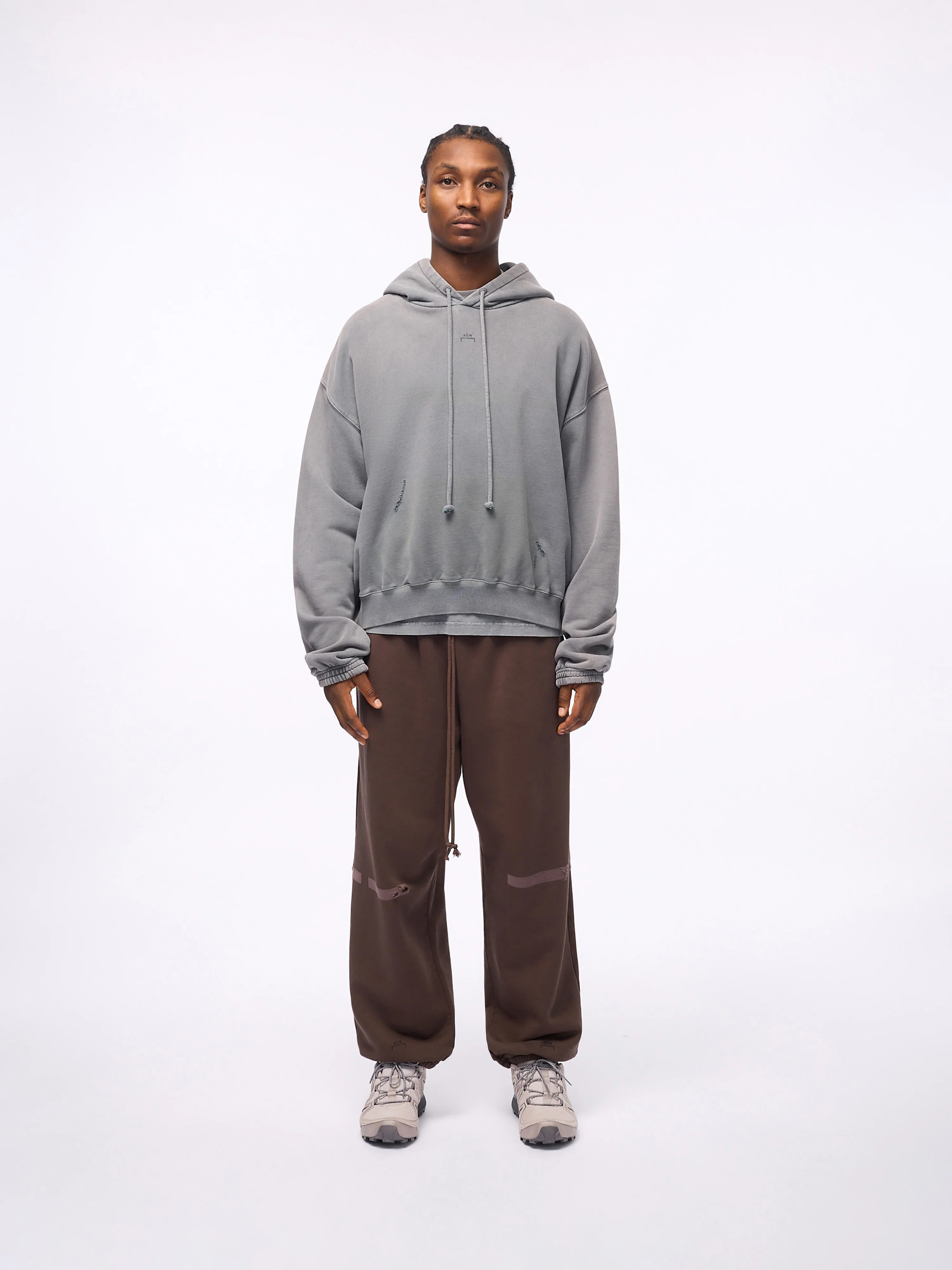 Relaxed cropped-fit cotton hoodie with a two-panel hood and adjustable tubular cotton drawcord. Finished with laser-faded linear graphics, distressing, and holes.